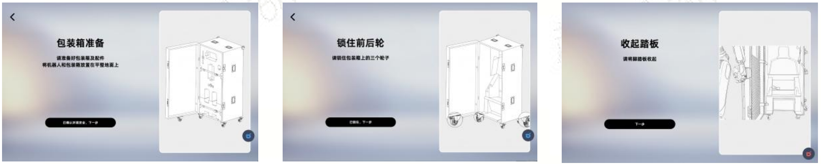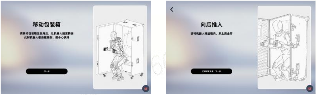 将包装箱及配件放置在平整地面上,并锁住包装箱上三个轮子。确保机器人处于安全环境,机器人切换为下蹲姿势,将机器人推进箱内,系上安全带。